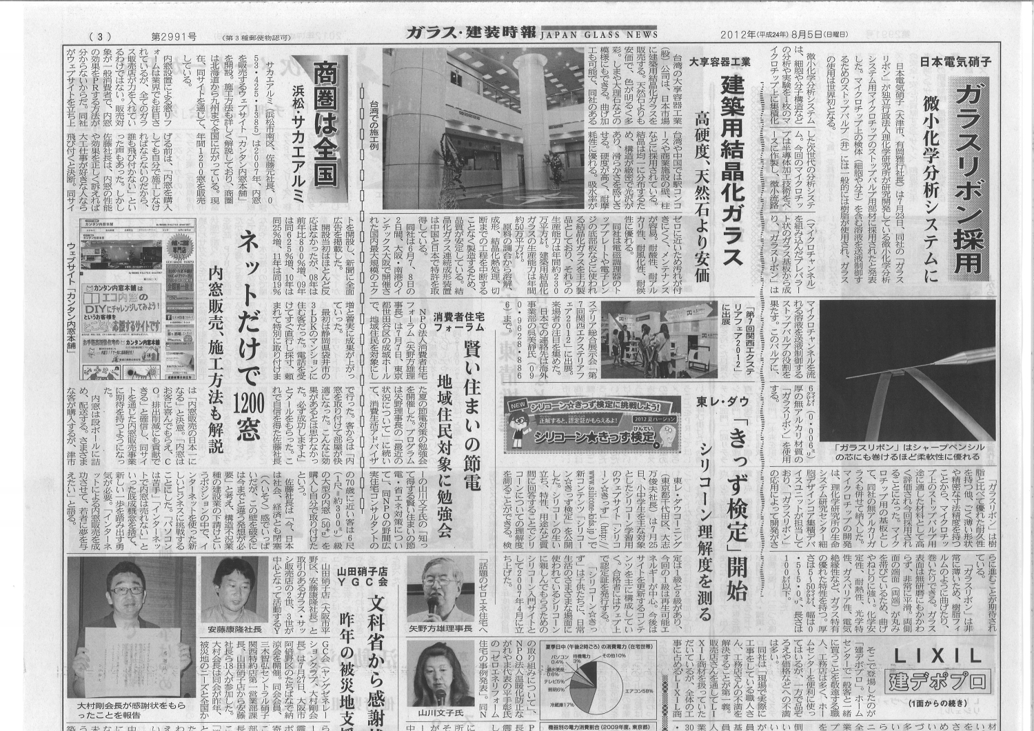 メディア紹介 2012.07.01 ガラス・建装時報で紹介されました② ガラス・建装時報 2012.8 『商圏は全国』という見出しで《ネットだけで1200窓》という記事を掲載して頂きました。先日の東京ビッグサイトでのセミナーの内容が記事になっていて、ちょっとびっくりです(笑) 発行:株式会社 時 報 社(東京編集部:大田区大森北4-12-3)